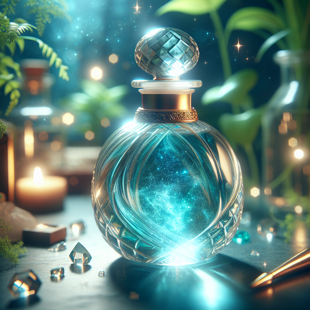 クリスタル瓶は透明なビー玉のような形状で、中には青い液体がきらめいています。ゴールドのキャップが添えられたこのエリクサーは、美しさと機能性を兼ね備えており、持っているだけでも心が豊かになる一品です。