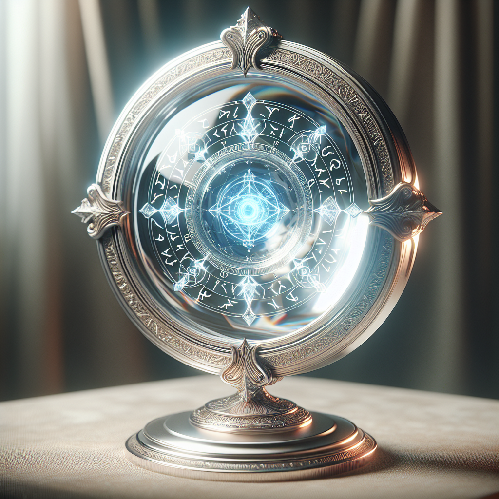 - 見た目: 透明なクリスタルレンズ、純銀のフレームに刻まれた古代のルーン、中央に輝く青い魔法のコア。
