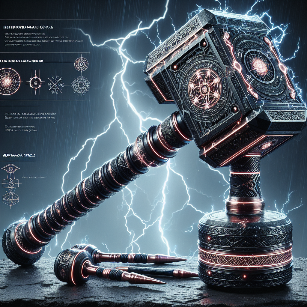 この槌には雷石のコアが内蔵され、魔法陣の刻印によってその力が増幅されます。内部に配置された電気伝導率の高い銅線が、強力な雷の力を的確に敵に伝えます。使用されている素材は耐久性に優れた神鉄鋼や耐摩耗合金で、長時間の激しい戦闘でもそのパフォーマンスを維持できます。